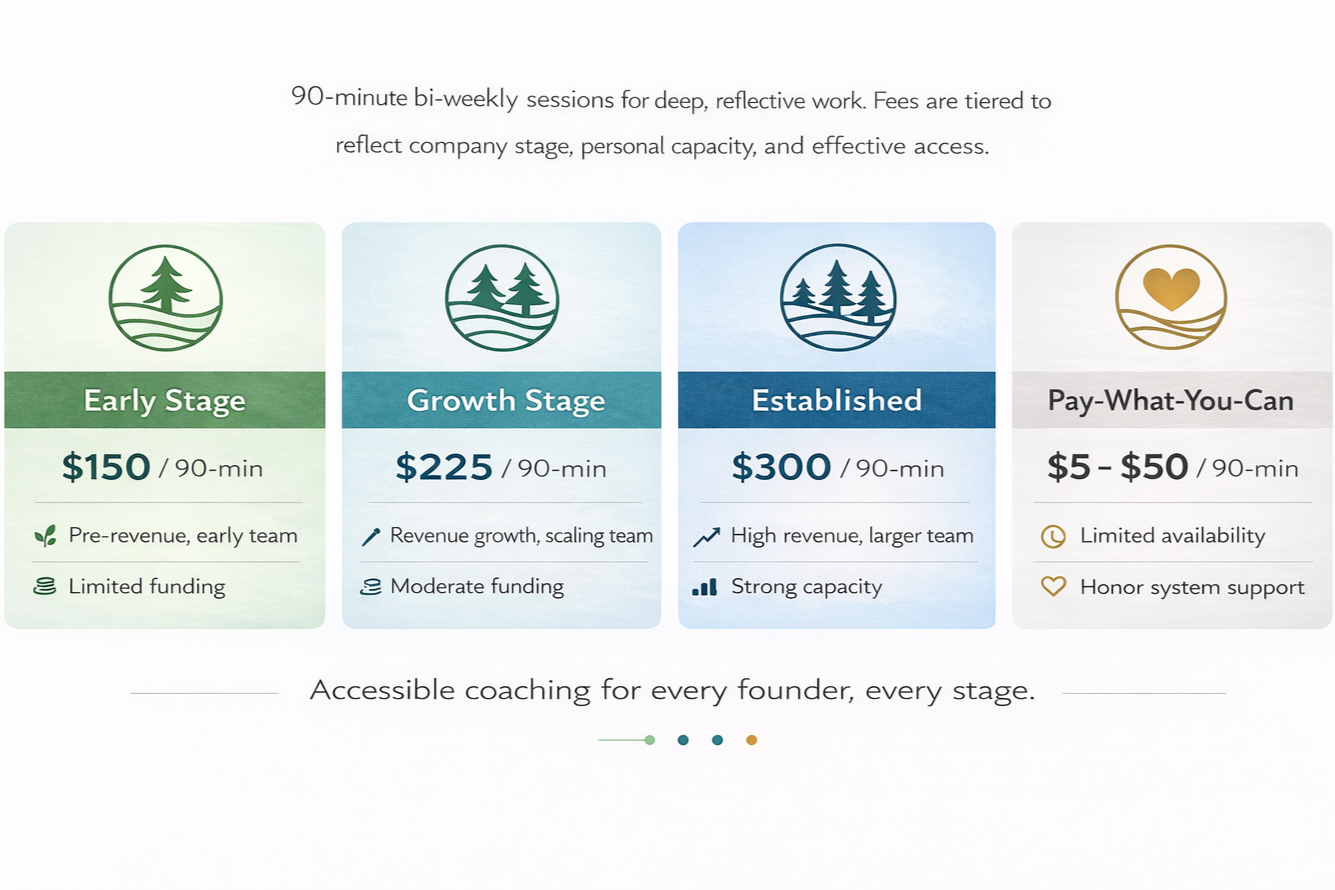 Coaching Should be Accessible Fees are tiered by company stage and ability to pay Schedule an Intro Call